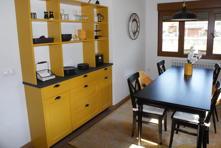 Una estancia alegre y luminosa, con todo aquello que se necesita para disfrutar de una buena comida o unos juegos de mesa en familia.